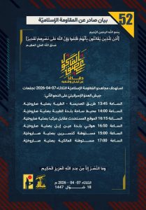 واصلت المقاومة الاسلامية اليوم مواجهاتها الاسطورية، وخاضت المعارك البطولية في مقابل الآلة الحربية الاسرائيلية على أرض جنوب لبنان، كما حافظت على وتيرة قصف القواعد العسكرية والمقار الهامة للجيش الاسرائيلي واستخباراته داخل الكيان المحتل، كرد على القصف الصهيوني الهمجي على المنشآت والمدنيين في لبنان.