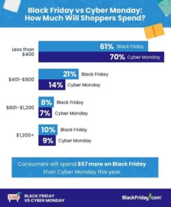 سيكون متوسط الإنفاق على الجمعة السوداء أعلى قليلاً من الإثنين الإلكتروني هذا العام، حيث ينفق المتسوقون ما متوسطه 472 دولارا في الجمعة السوداء ومتوسطا قدره 415 دولارا على الإثنين الإلكتروني.