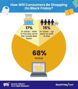 تنتقل عمليات التسوق في الجمعة السوداء إلى الإنترنت، حيث قال 68٪ من هؤلاء في تلك الأيام إنهم سيقومون بمعظم التسوق عبر الإنترنت.