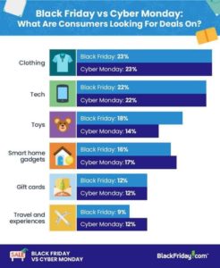 يقول حوالي ثلث المتسوقين في العطلات (31٪) إنهم سيجرون معظم التسوق في يوم الجمعة الأسود، في حين قال 22٪ منهم أنهم سيجرون معظم التسوق في الإثنين الإلكتروني.