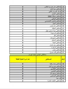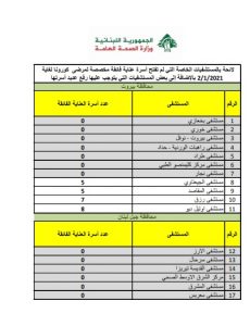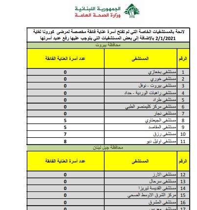 وأعلنت الوزارة أنها تنشر هذه اللائحة ليكون الرأي العام ووسائل الإعلام على بينة من الواقع وتحديد المسؤوليات، آسفة بشدة لعدم تلبية العدد الأكبر من المستشفيات نداء الواجب الإنساني والوطني في ظل التعبئة العامة والتفشي الواسع للوباء.