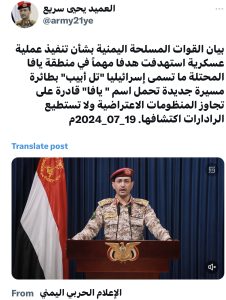 وجاء في بيان صادر عن القوات المسلحة اليمنية أنه “بعون الله تعالى تنفيذ عملية عسكرية نوعية استهدفت أحد الأهداف المهمة في منطقة يافا المحتلة (ما يسمى إسرائيليا تل أبيب)،وتم تنفيذ العملية بطائرة مسيرة جديدة اسمها “يافا” قادرة على تجاوز المنظومات الاعتراضية للعدو وحققت أهدافها بنجاح”.