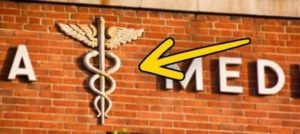 وفقا للأسطورة، فإن الإله اليوناني هيرميس كان رسولا بين الألهة والبشر(وهو ما يفسر الجناحين)، كما كان متحكما في العالم السفلي أي الجحيم (وهو ما يفسر العصا). كان هيرميس أيضا راعي الرحالة وهو ما يربطه بالطب، وسبب ربط الطب بالسفر هنا هو قيام الأطباء قديما بالسفر لمسافات بعيدة مشيًا على الأقدام لزيارة ومداواة مرضاهم. تشير إحدى النسخ من أسطورة هيرميس، إلى أنَ إله الشفاء والمسمى بأبولو (Apollo) أعطى العصا إلى هيرميس، في حين تشير أخرى إلى أنه أعُطِيَ العصا من قبل ملك الآلهة زيوس، وكانت العصا وقتها ملفوفة بشريطين اثنين أبيضين.