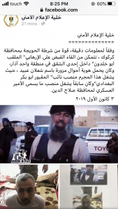 وجاء في بيان اعلنته خلية الاعلام الامني على صفحتها الرسمية في وسائل التواصل : “ان قوة من شرطة الحويجة في محافظة كركوك ، تمكنت من القاء القبض على علي الارهابي الملقب ابو خلدون في منطقة 1 آذار وعثرت بحوزته على هوية مزورة يستخدمها في تنقلاته باسم شعلان عبيد”.