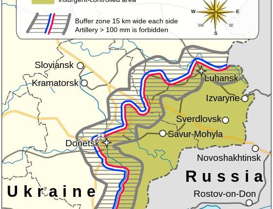 1- في 5 سبتمبر2014 بعد مشاورات ومساع ديبلوماسية ضمت مجموعة الاتصال الثلاثية الدولية “روسيا؛ اوكرانيا؛ ومنظمة الامن والتعاون في اوروبا OSCE” اضافة الى الرئيس الفرنسي فرانسوا هولاند والمستشارة الالمانية انجيلا ميركل وقع ممثلو المجموعة الثلاثية وقادة جمهوريتي دونيتسك الشعبية (DPR) ولوغانسك الشعبية (LPR “دون الاعتراف بوضعهما السياسي” بروتوكول “مينسك” Minsk عاصمة بيلاروسيا، الذي قضى بوقف القتال وانهاء حالة الحرب في منطقة دونباس..