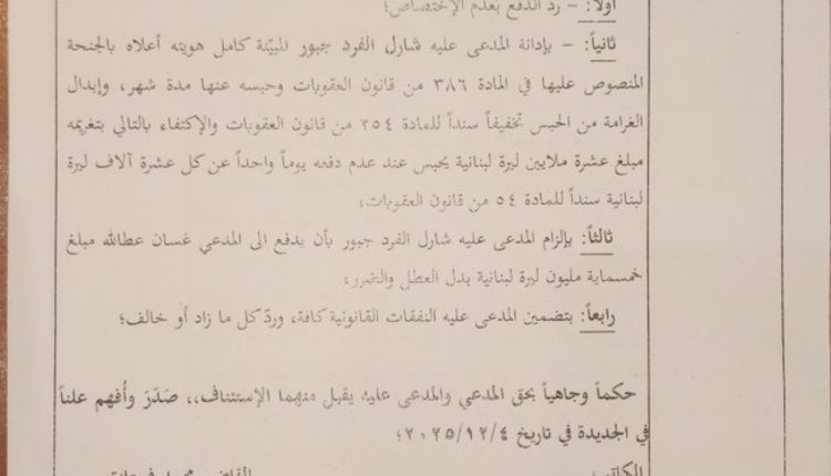 أعلن المحامي ماجد بويز ان القاضي المنفرد الجزائي في المتن أصدر حكماً قضائياً قضى بإدانة رئيس جهاز الإعلام والتواصل في حزب “القوات اللبنانية” شارل جبور بجرمَي القدح والذم، وذلك على خلفية العبارات والنعوت التي وجّهها بحق النائب غسان عطالله.