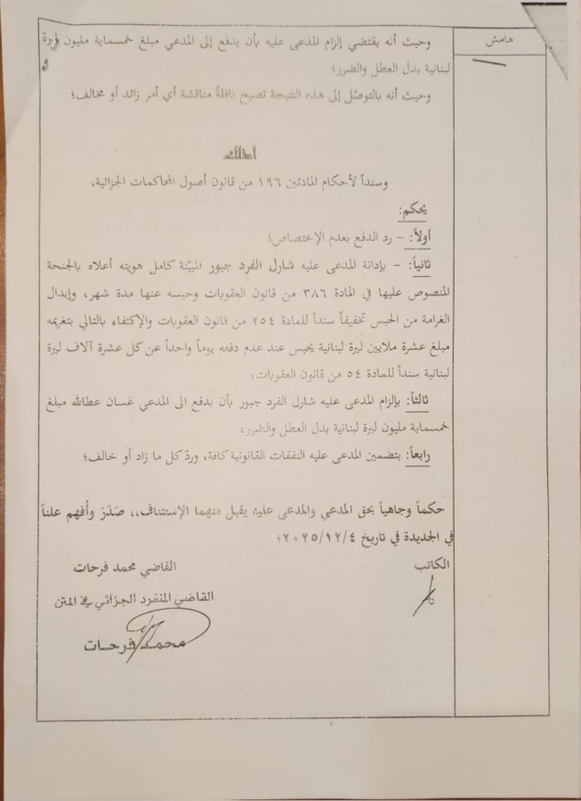 وبحسب بويز، ألزم القرار القضائي جبور بدفع غرامة مالية، إضافة إلى تعويض بقيمة 500 مليون ليرة لبنانية كعطل وضرر لصالح النائب عطالله.