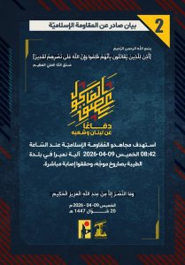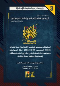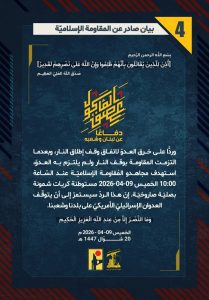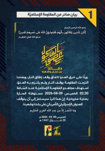 دفاعًا عن لبنان وشعبه، وردًّا على خرق العدوّ لاتفاق وقف إطلاق النار، وبعدما التزمت المقاومة بوقف النار ولم يلتزم به العدوّ، استهدف مجاهدو المُقاومة الإسلاميّة عند السّاعة 02:30 الخميس 09-04-2026 مستوطنة المنارة بصليّة صاروخيّة.