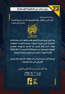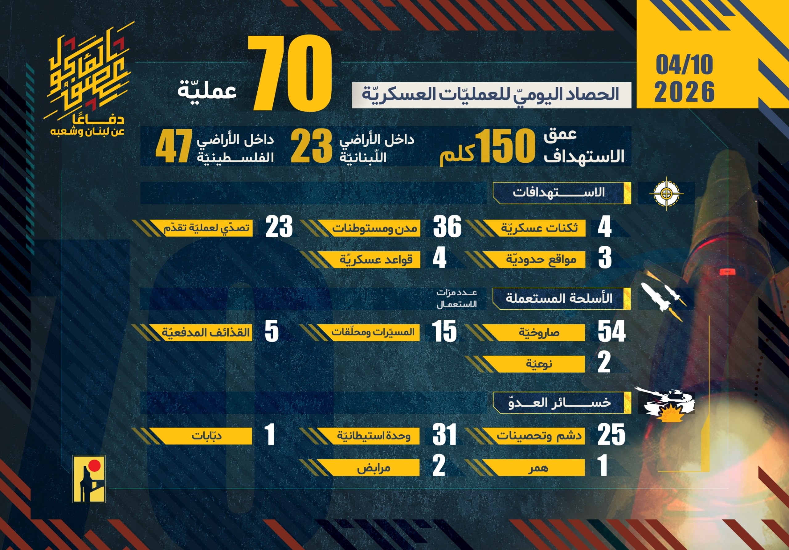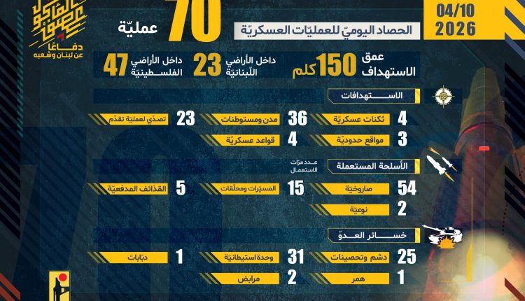 واصلت المقاومة الاسلامية اليوم مواجهاتها المباشرة اقوات الاحتلال الاسرائيلي، كما واصلت القصف الصاروخي والمسيَّر على القواعد العسكرية الاسرائيلية المنتشرة داخل الكيان المحتل، كردود على القصف الوحشي والغارات على المدنيين والمنشآت في لبنان.