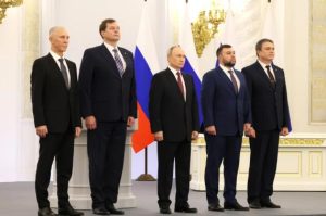 في قرار مدروس لا اعتباطي مدرج على لائحة الخيارات العسكرية ضمن معادلة التناسب او التكافوء مع حجم الاهداف المحققة سواء على الصعيد الجيو استراتيجي كما السياسي “مرحليآ” صادق الرئيس الروسي فلاديمير بوتين على مراسيم ضم الاقاليم الاربعة دونيتسك؛ لوغانسك؛ زاباروجيا وخيرسون الى الاتحاد الروسي وذلك في احتفالية مطلوبة بعد عمليات استفتاء على مدى اربعة ايام اجرتها الإدارات الموالية لموسكو..!