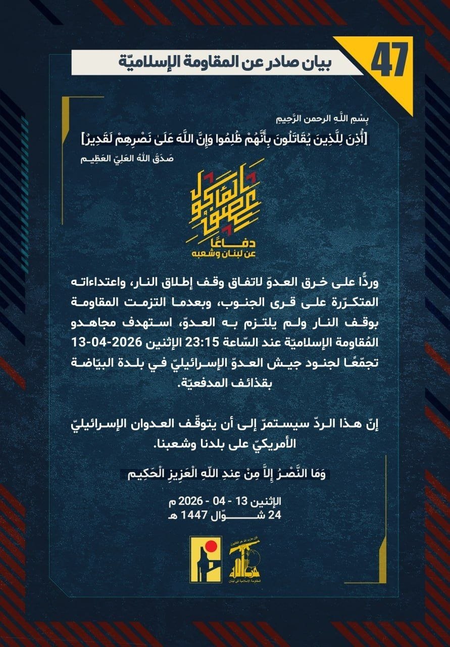 تحت عنوان دفاعًا عن لبنان وشعبه، ردًّا على خرق العدوّ لاتفاق وقف إطلاق النار، واعتداءاته المتكرّرة على قرى الجنوب، وبعدما التزمت المقاومة بوقف النار ولم يلتزم به العدوّ، أصدرت المقاومة الإسلامية اليوم الإثنين جردة مفصلة بعملياتها القتالية وهي عبارة عن 47 بيانًا عسكريًا تتناول عمليات التصدي لتحركات العدو الإسرائيلي عند الحدود اللبنانية الفلسطينية، وكذلك عمليات استهداف مواقع وقواعد وانتشار جيش العدو الإسرائيلي ومستوطناته في شمال فلسطين المحتلة، وفقًا للآتي:
