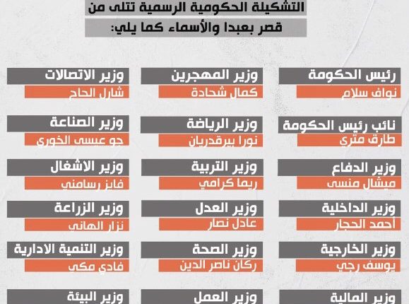 أخيرا، وبعد انتظار مفاوضات كانت شاقة، أبصرت حكومة الرئيس نواف سلام النور اليوم بعيد لقاء جمع الرؤساء الثلاثة عون وبري وسلام في القصر الجمهوري، حيث خرج الدخان الاسود بعد الاتفاق على اسماء الوزراء في حكومة من 24 وزيراً أبعدت عنها ما امكن من الفاسدين واللصوص المعلنين والمحروقين. وجاءت التشكيلة الوزارية على النحو الآتي: