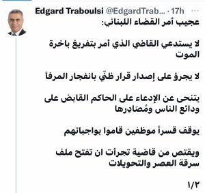 وقال طرابلسي في تغريدة اولى : ” عجيب أمر القضاء الليناني ، لا يستدعي القاضي الذي أمر بتفريغ باخرة الموت. لا يجرؤ على إصدار قرار ظني بانفجار المرفأ. يتنحى عن الادعاء على الحاكم القابض على ودائع الناس ومُصَادِرها. يوقف قسراً موظفين قاموا بواجباتهم. ويقتص من قاضية تجرأت ان تفتح ملف سرقة العصر والتحويلات.
