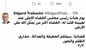 وتابع طرابلسي في تغريدة ثانية كاشفاً “يوم هنأت رئيس مجلس القضاء الاعلى عند تعيينه قلت له القضاء أكثر من يمثِّل الله على الارض.