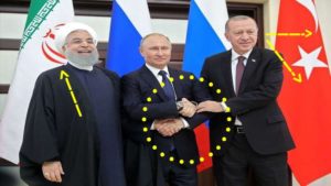 في مشهد “سوريالي” surrealism مُتكرر – و قَبيل دخولهم قاعة ألإجتماعات و ألغَوص في تعقيدات ألملف ألسوري ميدانيآ و سياسيآ ،، كانت ألصور ألتذكارية تُلتَقط كالمعتاد للرؤساء ألثلاثة ألإيراني حسن روحاني و ألتركي رجل طيب أردوغان يتوسطهما ألرئيس ألروسي فلاديمير بوتين و هم يتصافحون و في خلفية ألمَنَصة أعلام دولهم .. “ألبيئة وديَة = توظيف جغرافية ألمَكان”..