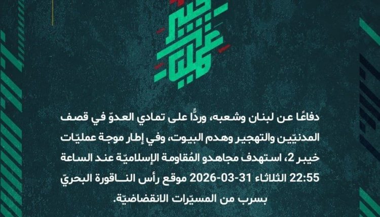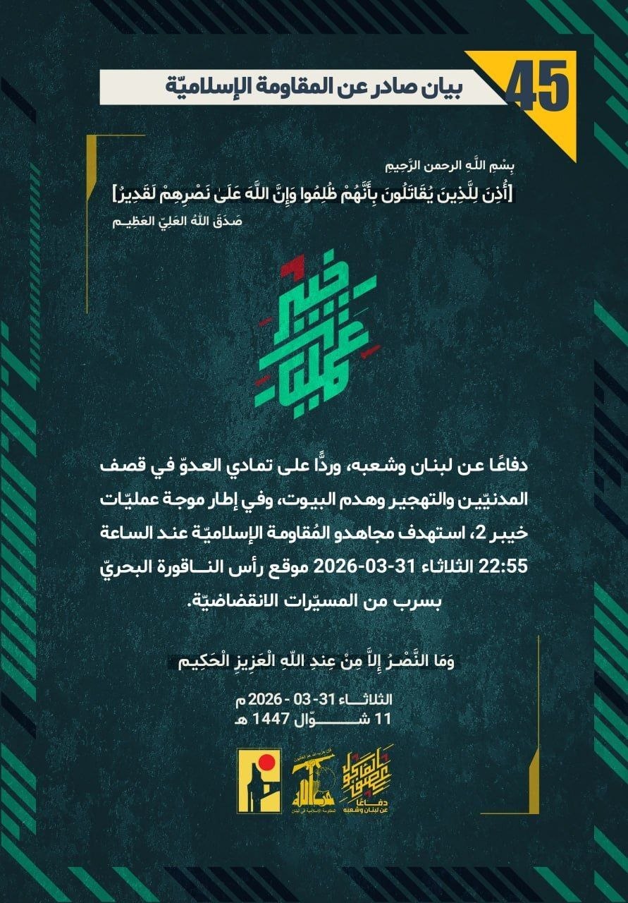 بعنوان دفاعًا عن لبنان وشعبه، أعلنت المقاومة الإسلامية عن جردة ببياناتها القتالية لليوم الثلاثاء 31/03/2026، ضمن 45 بيانًا عسكريًا حول عمليات التصدي لتحركات العدو الإسرائيلي عند الحدود اللبنانية الفلسطينية، وكذلك عمليات استهداف مواقع وقواعد وانتشار جيش العدو الإسرائيلي ومستوطناته في شمال فلسطين المحتلة، وفقًا للآتي: