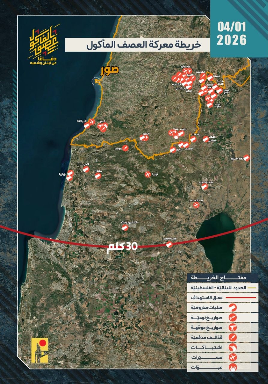 بعنوان دفاعًا عن لبنان وشعبه، أصدرت المقاومة الإسلامية جردة تفصيلية بعملياتها القتالية التي خاضها مقاتلوها اليوم الأربعاء في 01/04/2026، وهي عبارة عن 60 بيانًا عسكريًا يتناول عمليات التصدي لتحركات العدو الإسرائيلي عند الحدود اللبنانية الفلسطينية، وكذلك عمليات استهداف مواقع وقواعد وانتشار جيش العدو الإسرائيلي ومستوطناته في شمال فلسطين المحتلة، وفقًا للآتي: